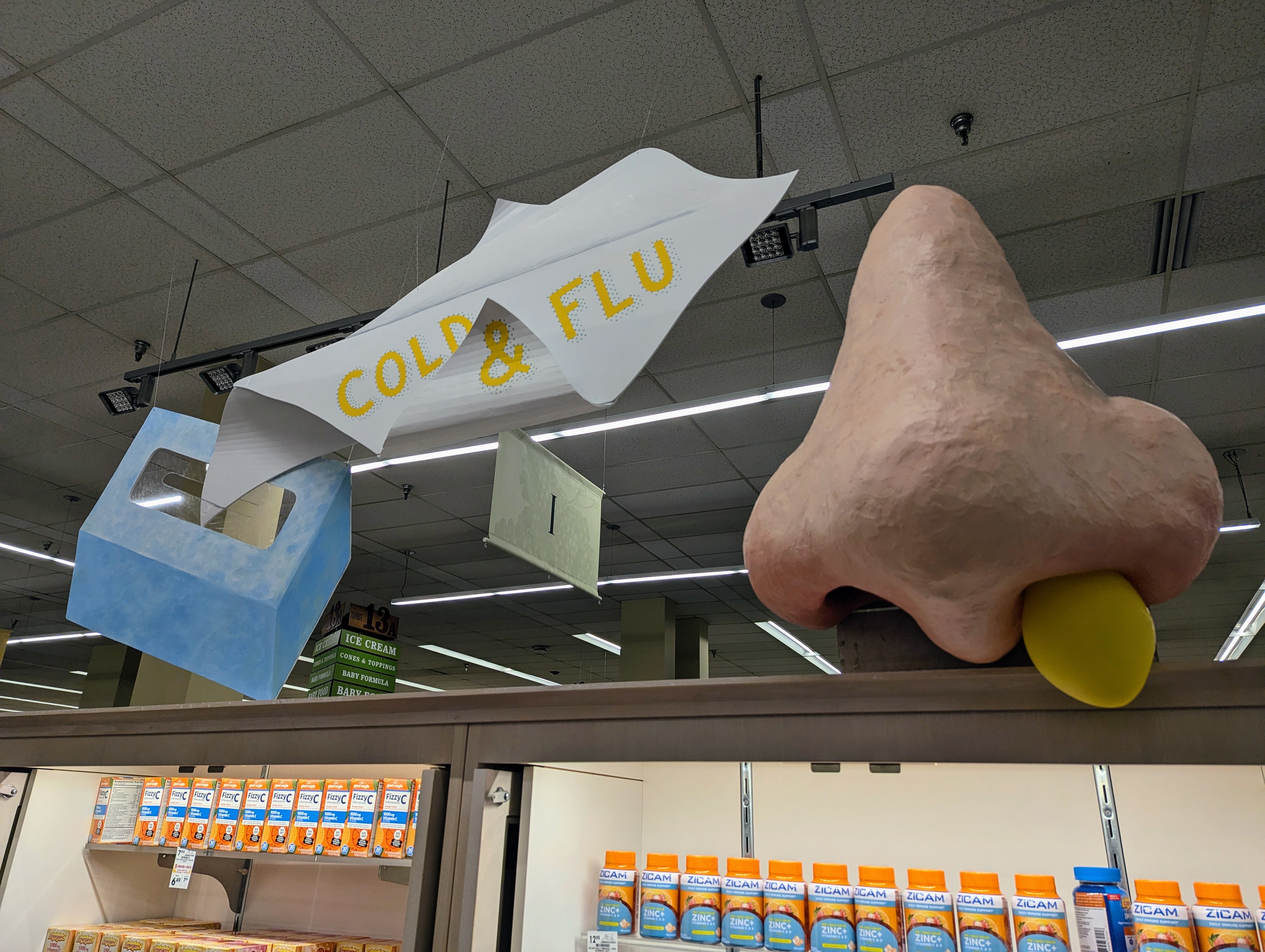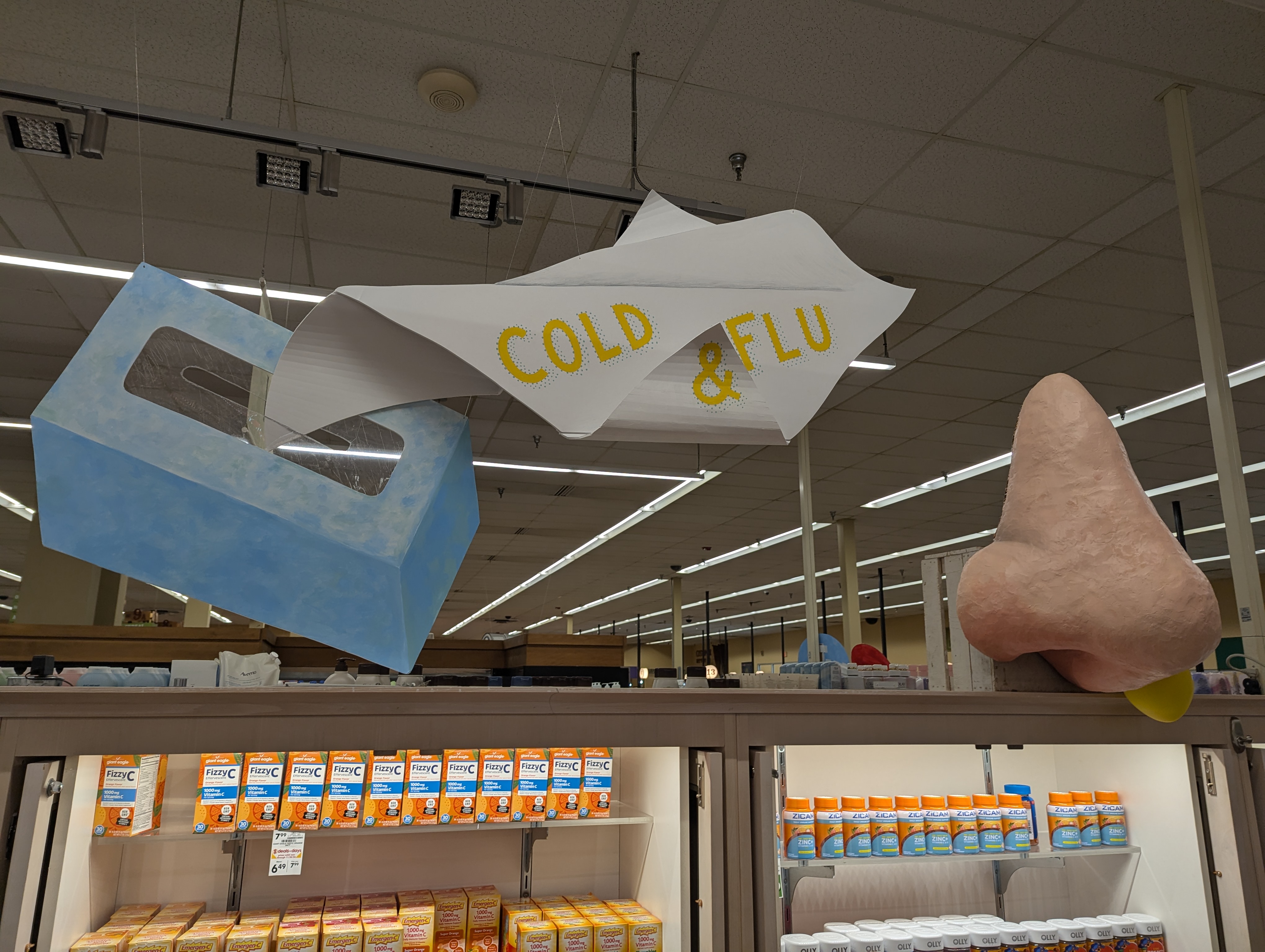 Inspired by the playful chaos of the game show Double Dare, I built this oversized nose and matching tissue box to grab attention in the cold & flu aisle. A closer look reveals a bubble of snot and even broom bristles tucked inside the nostrils—small details that add a touch of humor and surprise. Shoppers of all ages noticed, but kids especially seemed to love this one.